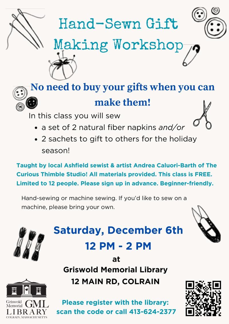 Taught by local Ashfield sewist & artist Andrea Caluori-Barth! All materials provided. This class is FREE. Limited to 12 people. Please sign up in advance. Beginner-friendly.