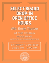 The third in a series of drop-in open office hours with a member of the Select Board. This meeting will be hosted by Chair Emily Thurber on Saturday 12/6 from 12pm - 2pm at the Colrain Wood Bank located on Charlemont Rd. The Wood Bank is on the left before the entrance to the Transfer Station.