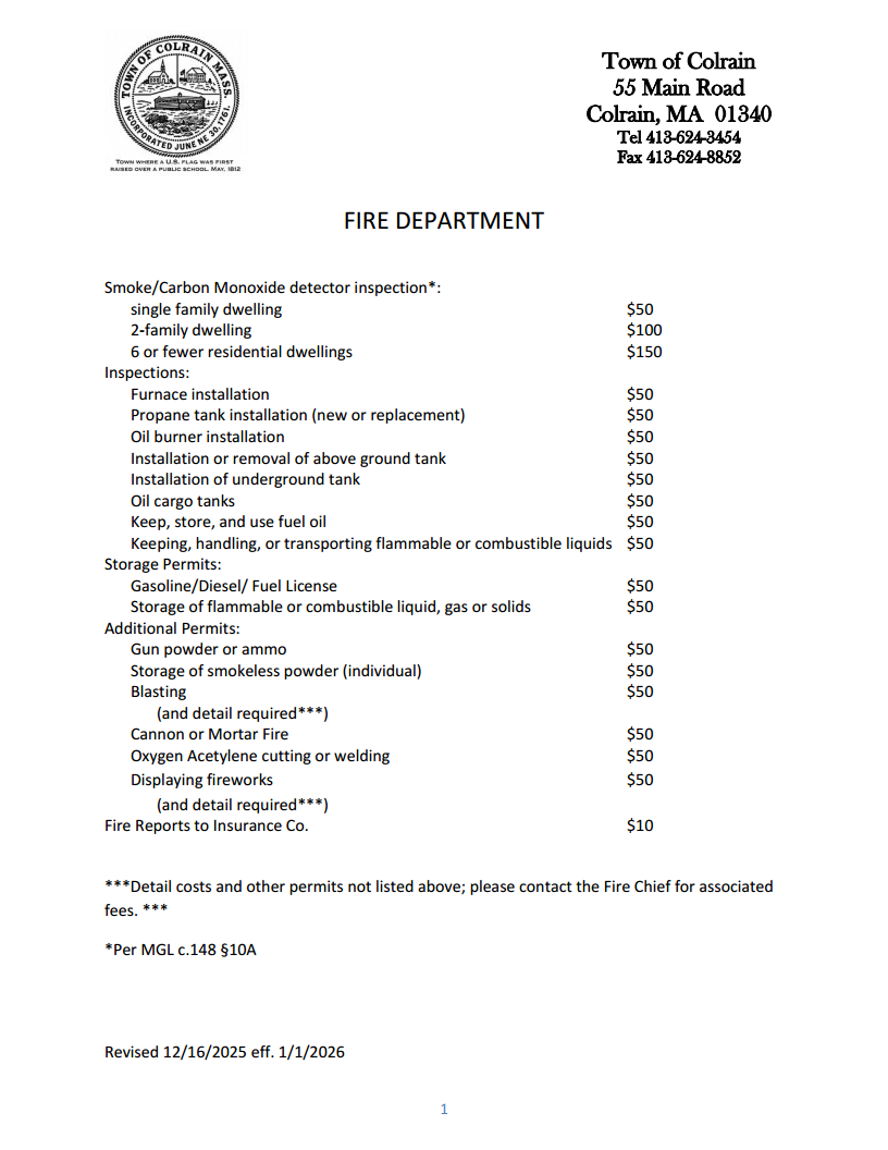 On Tuesday 12/16/2025, the members of the Select Board voted to increase the fees for Fire Department inspections, most notably for smoke detector and carbon monoxide detectors. The inspection fee was set per MGL c.148 §10A.